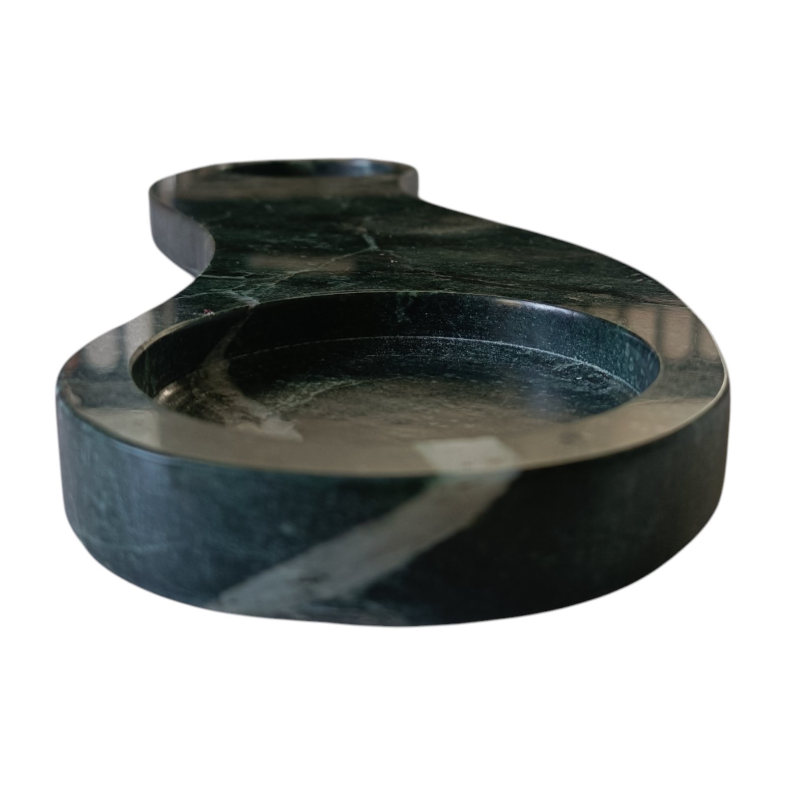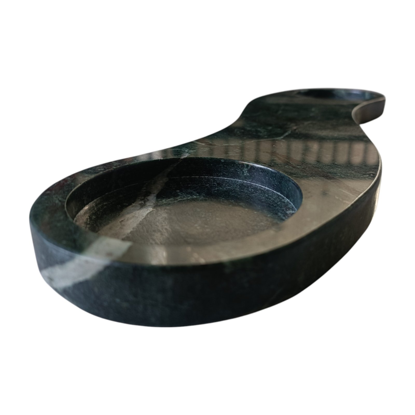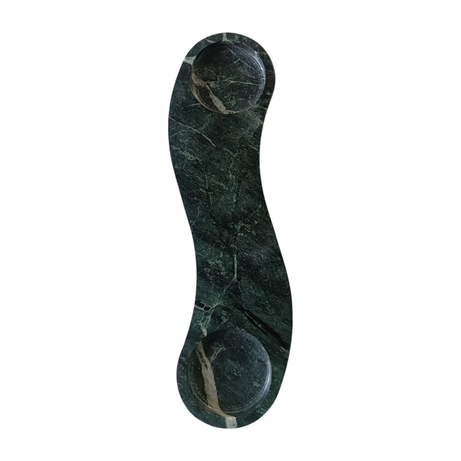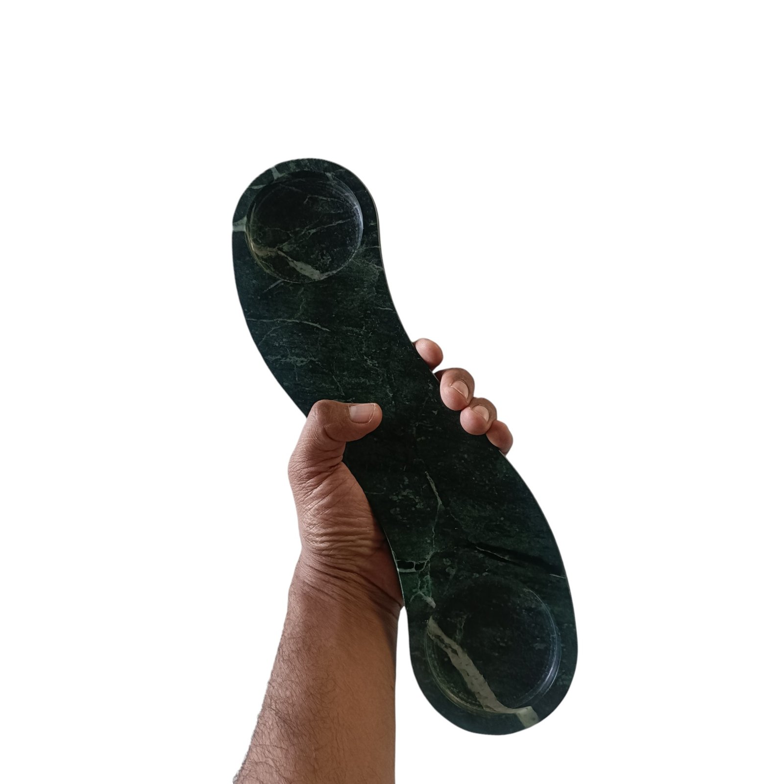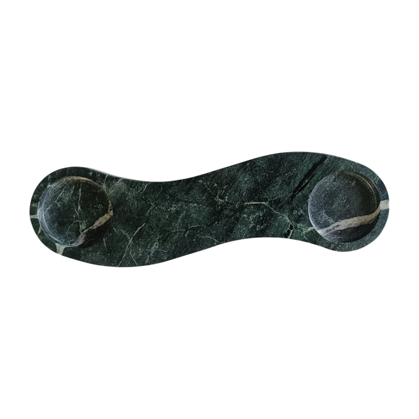 This elegant green marble tray, used for keeping candles on dinner tables, is beautifully shaped and has a flat bottom. It can store keys, Jewellery, small items. The size is excellent for various uses, and the raised edges keep the contents in place. It can be kept at the side of the tables or on the console.