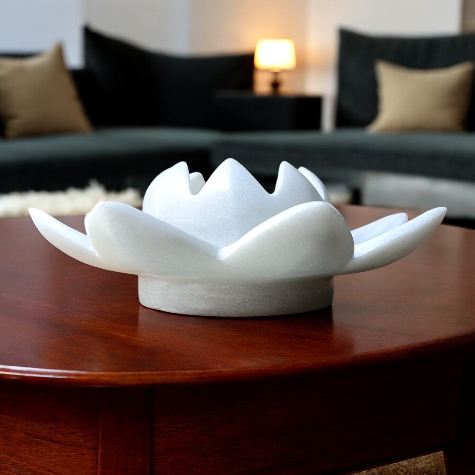 Lotus Shape White Marble Candle Stand – 9 Inch Hand Carved Holder