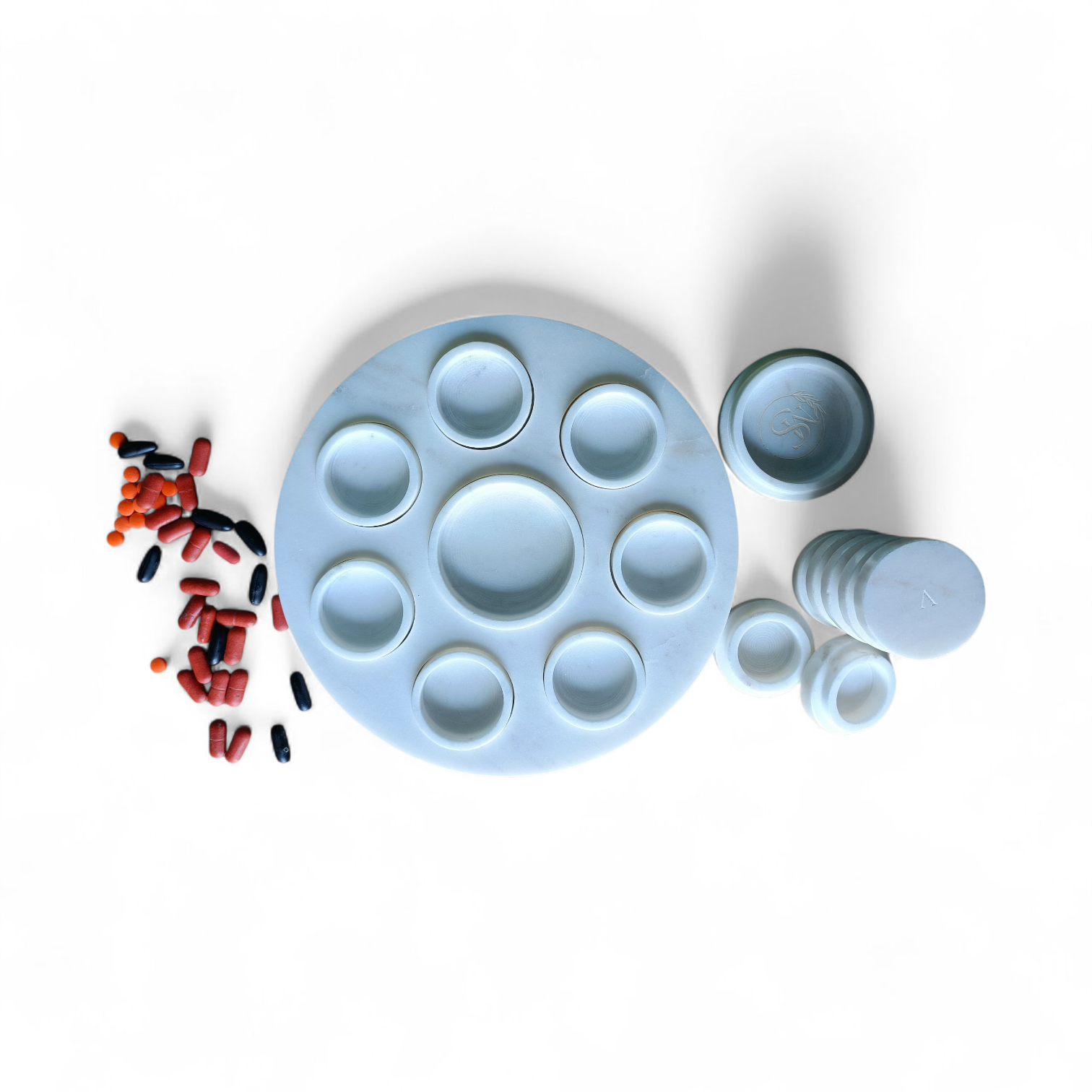 Elevate your daily wellness routine with the LIFELINE Pill Box – a beautifully handcrafted piece that combines function with luxury. Thoughtfully designed in a round plate shape, this elegant organizer holds 7 individual mini pill boxes, each representing a day of the week.