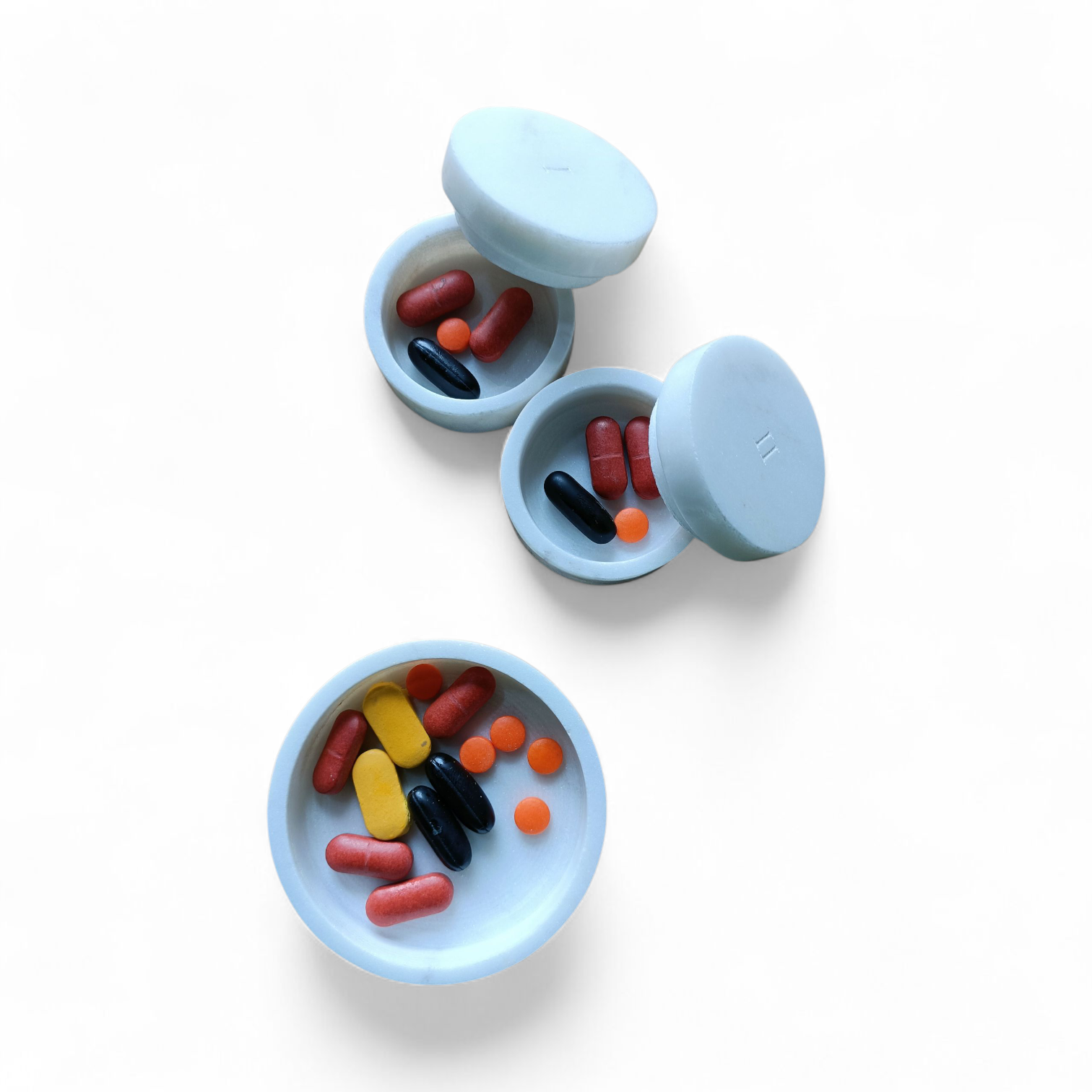 Each small, round container comes with a secure lid and is spacious enough to store your daily pills. Designed for convenience, you can easily lift each mini box out from the base plate, take your pills, and place it back – simple, seamless, and satisfying.
