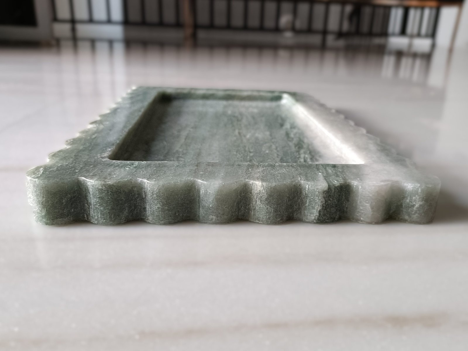 Elegant, a beautifully carved marble tray in a rectangular shape with a flat bottom. It can be used to keep your keys, jewellery, or small items to serve cookies, or it can be placed as a decorative piece. The size is excellent for various uses, and the raised edges keep the contents in place. It can be used to serve drinks in this tray. It can be kept at the side of the tables or on the console.